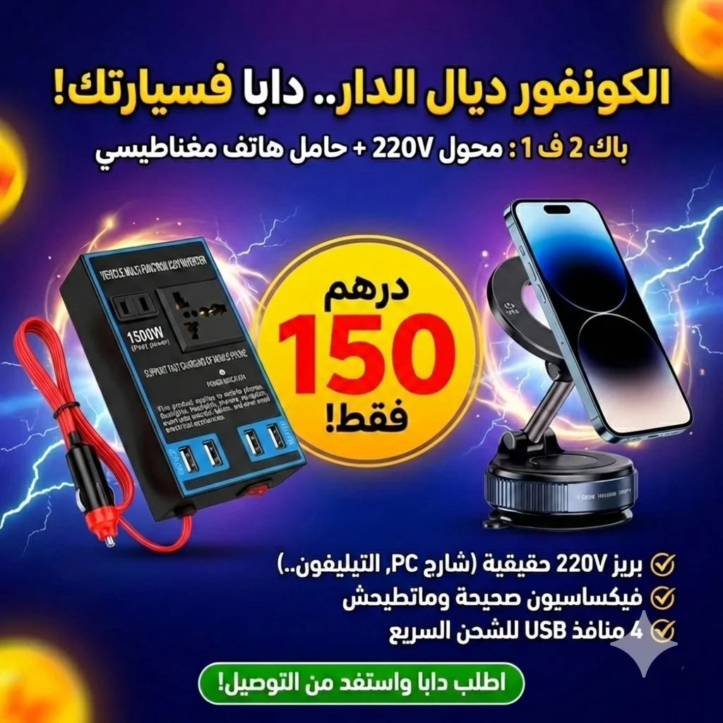 باك 2 في 1 للسيارة: محول كهرباء 220V + سيبورة مغناطيسية للتليفون
